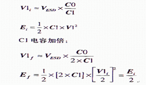 V1=VESD×C0/(C0+C1)或20V=2kV×100pF/(100pF+0.01μF)