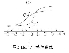 鑒于LED 的芯片有9×9mil (250×250um),10×10mil,11×11mil (280×280um),12×12mil (300×300um),故pn 結面積大小不一,使其結電容(零偏壓)C≈n+pf左右。C-V 特性呈二次函數關系(如圖2)。由1MHZ 交流信號用C-V 特性測試儀測得。