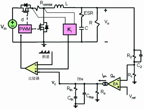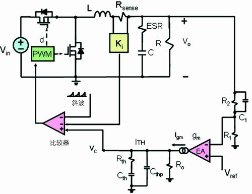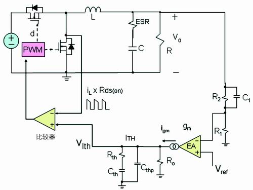 通過前面的討論可知,在每個開關周期,低端的開關管流過的電流波形為下降階段的梯形波。這種電流模式常稱為谷點電流模式。和峰值電流模式一樣,谷點電流模式反饋也有兩個環(huán)路:一個電壓外環(huán),另一個是電流內環(huán)(見圖2)。