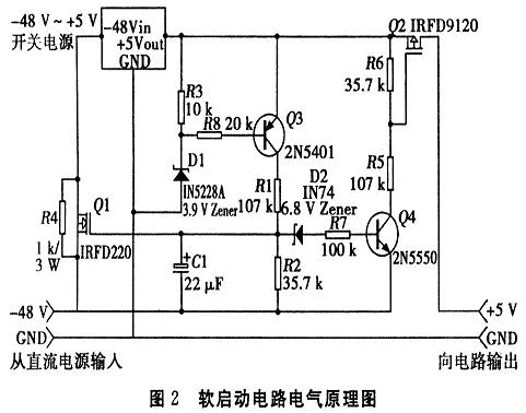 下面采用一個從-48V~+5V的開關電源路論述“軟啟動”技術。所用的開關電源是一個含有LT1172HVCT的穩壓器,從負到正補償提升式(buck-boost)轉換器,其實任何一個從-48V~+5V的開關電源都能工作。其中,軟啟動電路和開關電源電路是相互獨立的,電氣原理如圖2所示。