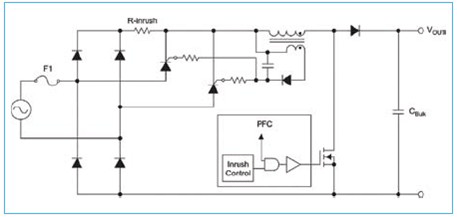 UCC28070 以連續(xù)導電模式 (CCM) 運行。同時,也可選用 UCC28060——以轉(zhuǎn)移模式 (TM) 運行。UCC28060 具備類似的優(yōu)點,這些優(yōu)點源于波紋電流的消除,但是同時還提供了一些較低成本的解決方案。最引人矚目的是,由于在轉(zhuǎn)移模式下運行時,不存在反向恢復條件,所以采用低成本的升壓二極管。在 UCC28070 或其設計中集成浪涌電流限制功能,只需將圖 3 中的浪涌電流組件添加到其中的一個相位電感上即可。