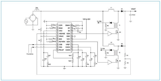 圖 3 顯示了業(yè)界首款單芯雙相交錯式 PFC 預調(diào)節(jié)器——TI UCC28070 的簡化原理圖。交錯雙相相互之間的相位差為 180°,這樣則消除了波紋電流,從而可以使用更小的電磁干擾 (EMI) 濾波器以及外觀更小巧的 PFC 輸出電容器。雙相交錯式拓撲結(jié)構(gòu)、體積更小的元件是嵌入式馬達驅(qū)動電路的理想解決方案。交錯式 PFC 可滿足非常高的功率密度要求。