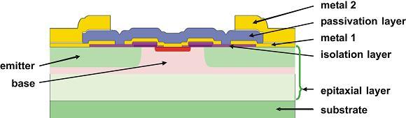 通過(guò)選擇不同的低電阻襯底,比如:圖1所示的摻磷/摻砷襯底,可以有效降低半導(dǎo)體中的電壓降比例。另一個(gè)重要的影響因素是電流分配,應(yīng)在整個(gè)芯片范圍內(nèi)盡可能保持均衡,將芯片前端金屬化擴(kuò)展電阻降至最低。對(duì)于BISS晶體管,芯片中的均衡電流分配通過(guò)一種稱(chēng)為網(wǎng)格技術(shù)的手段來(lái)實(shí)現(xiàn)——將晶體管分成不同的格柵結(jié)構(gòu)。第四代BISS晶體管采用受專(zhuān)利保護(hù)的雙層金屬化布局,能夠最大程度提升發(fā)射極線路金屬厚度,降低飽和電阻(參見(jiàn)圖2)。
