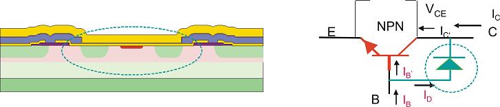 要在降低飽和電壓的基礎(chǔ)上縮短開(kāi)關(guān)時(shí)間,關(guān)鍵是最大程度降低開(kāi)關(guān)操作中晶體管的擴(kuò)展電容。這主要通過(guò)集成寄生的鉗位結(jié)構(gòu)(圖3)來(lái)實(shí)現(xiàn),該設(shè)計(jì)可以避免過(guò)驅(qū)動(dòng)處于飽和狀態(tài)的晶體管,能夠有效降低晶體管的存儲(chǔ)時(shí)間ts。