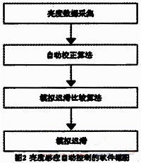亮度感應自動控制的軟件架構主要包含亮度數據采集、實時監測技術、自動校正算法和模擬遲滯比較算法。亮度數據采集是通過光感應器感應周圍環境的亮度,將亮度信號轉換為模擬電信號,再由ADC轉變為數字信號,此數字信號再送到液晶電視的CPU進行處理。通過亮度數據采集到的數字信號,送到CPU進行自動校正算法處理;然后再進行模擬遲滯比較算法得到穩定的PWM信號;由控制背光亮度模塊控制液晶面板的背光。如圖2所示。