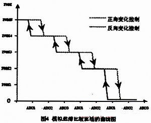 模擬遲滯比較算法與普通的自動感應亮度控制的一個閾值電壓不同,設定了兩個閾值電壓,分別稱為正向閾值電壓和負向閾值電壓。在環境亮度輸入信號從低電平(暗)上升到高電平(亮)的過程中使PWM電路狀態發生變化的輸入電壓稱為正向閾值電壓,在輸入信號從高電平(亮)下降到低電平(暗)的過程中使PWM電路狀態發生變化的輸入電壓稱為負向閾值電壓。