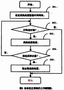 亮度感應自動控制的自動校正算法的步驟:首先設定采集亮度數據的時間間隔以及設定采樣次數;當時間間隔定時到時,讀取光感應器亮度的數據;當采樣次數到達預設次數后,輸出穩定的亮度;再由CPU輸出穩定的PWM,去控制液晶面板的背光。設定采集亮度數據時間間隔201是初始化每次采集光感應器亮度的時間。時間定時到202是達到可以去采集光感應器亮度的時間。采集亮度數據203是CPU讀取光感應器亮度數據通過ADC的數字信號的數值。到達采樣次數204是到達采集亮度數據都一樣的次數,表示環境亮度已經穩定,不再變化。輸出穩定的亮度205是CPU輸出穩定的PWM去控制液晶面板的背光。如圖3亮度感應自動控制的自動校正算法的工作流程所示。