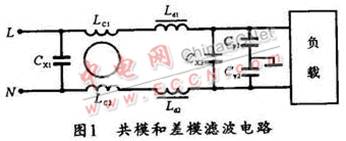 開關(guān)電源的開關(guān)頻率及其諧波的主要表現(xiàn)是電源線上的干擾,稱之為傳導(dǎo)干擾。傳導(dǎo)干擾分為共模干擾和差模干擾。共模干擾是由載流導(dǎo)體與大地之間的電位差產(chǎn)生的,其特點(diǎn)是兩條線上的干擾信號電壓是同電位同相的;而差模干擾則是由載流導(dǎo)體之間的電位差產(chǎn)生的,其特點(diǎn)是兩條線上的干擾信號電位相同,但相位相反。事實(shí)上,針對不同的干擾信號,EMI濾波電路也分為抗共模干擾濾波電路和抗差模干擾濾波電路,圖1所示是其濾波電路。