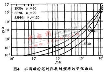 共模電感線圈如圖l中Lcl,Lc2是繞在一只磁芯上的兩組獨(dú)立的線圈,所繞圈數(shù)相同,繞向相反。這樣,當(dāng)EMI濾波器接入電路后,兩組線圈產(chǎn)生的磁通在磁芯中將相互抵消,故不會使磁芯飽和。對于干擾信號而言,共模磁芯一般工作在低磁場區(qū)域,所以,共模濾波電感選用的磁性材料要求具有較高的初始磁導(dǎo)率μi。如果只針對濾波器的插入損耗這一指標(biāo),則初始磁導(dǎo)率μi越高,濾波電路呈現(xiàn)的感抗就越大,所得到的插入損耗指標(biāo)就越好。但在整個電路中,還要綜合考慮磁性材料在電路中的其它特性,如頻率阻抗特性、居里溫度、磁材的形狀等等。μi值不同的各種磁性材料,在不同頻率下的阻抗特性也不一樣,故要根據(jù)所需要的頻率范圍來選取合適μi值的磁性材料。圖3所示是不同類型的高μi軟磁材料在同樣條件下的頻率與阻抗關(guān)系曲線,該曲線反映出電感磁芯的插入損耗變化趨勢。其它的性能參數(shù)(如電感值、體電阻等)如表1所列。