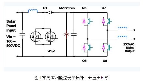 升壓+H-橋拓撲是太陽能逆變器極為常用的拓撲之一,是一種兩級非隔離拓撲。其第一級是升壓級,用于把模塊的可變輸出電壓(例如100V – 500V)升高到更大的中間電壓,后者必須大于實際峰值主線電壓(如230V x sqrt(2),或>325V)。該升壓級還有一個重要作用,就是為了實現效率最大化,太陽能模塊必須運作產生盡可能大的功率,而太陽能模塊的功率 曲線可通過輸出電流乘以輸出電壓數值獲得。功率特性中有一個最大點,被稱為“最大功率點”或MPP,而這精確位置會隨著模塊的類型、溫度和日照陰影等因素而變化。