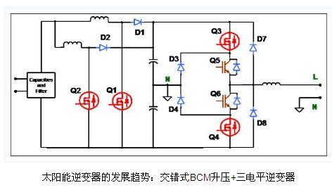 太陽能逆變器設計的另一個趨勢是擴大輸入電壓范圍,這會導致相同功率級下輸入電流的減小,或相同輸入電流下功率級的提高。輸入電壓比較高時,需要使用額定電壓更高(1200V范圍內)的IGBT,從而產生更大的損耗。解決這一問題的一個方法是采用三電平逆變器。
