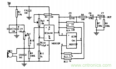監(jiān)控拾音器的輸出加入了由c6、R7、c 7、R8構(gòu)成兩級(jí)Rc高通濾波器,濾除信號(hào)中的高頻成分,同時(shí)電容又起了隔直的作用,使電路達(dá)到了較好的性能。
