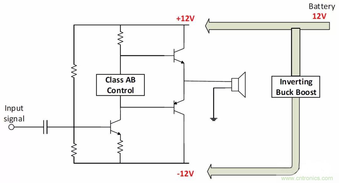 雙電源放大器比較常見,因為它效率更高,能夠在不導(dǎo)致DC損耗的前提下復(fù)制輸入波形。圖11A顯示了具有±12V軌的音頻放大器,圖11B顯示了具有±5V軌的運算放大器。