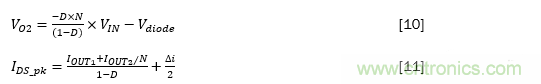 其中VIN是輸入電壓,VO2是次級輸出電壓,Vdiode是二極管正向壓降,D是占空比,N是變壓器匝數(shù)比,Ids_pk是通過頂部開關(guān)的峰值電流,△i是主電感器紋波電流的三角部分,IOUT1和IOUT2分別是由VO1和VO2,生成的輸出電流。