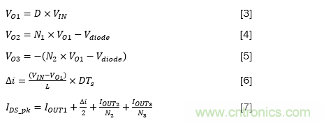 其中VO1是主輸出,VO2和VO3分別是正和負次級輸出,D是占空比,N1和N2分別是與VO2和VO3對應(yīng)的變壓器的匝數(shù)比。Vdiode是二極管的正向壓降,IOUT1、IOUT2和IOUT3分別是由VO1、VO2和VO3生成的輸出電流,Ids_pk是通過頂部開關(guān)的峰值電流,△i是主電感器紋波電流的三角部分。