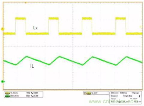 在高壓側(cè)開關(guān)接通的周期中(圖5中綠色箭頭指示電流),電感器電流斜坡上升,將能量儲存在電感器中,輸出電容器向負載提供電流。在低壓側(cè)開關(guān)接通的周期中(圖5中紅色箭頭指示電流),電感器電流斜坡下降,向負載提供電流,并為輸出電容器充電。ISL85415EVAL2Z反相降壓-升壓電路板的工作波形如圖6所示。
