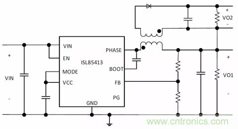仍然運用通過耦合電感器或變壓器生成次級輸出這個概念,但二次側(cè)可以按不同方式配置,以生成正或負的次級電壓。為了生成正次級輸出,要將變壓器/耦合電感器和二次側(cè)二極管的極性反過來。圖3顯示了隔離式降壓拓撲生成兩個+VOUT軌。