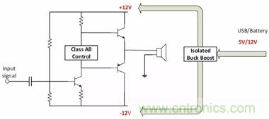 為這類應(yīng)用選擇合適的拓撲時,需要考慮輸入電壓。例如,為以±12V軌運行的音頻放大器供電,如果輸入電源軌是24V,就選擇隔離式降壓拓撲。如果使用12V電池,就可以用反相降壓-升壓拓撲,以生成負壓軌。如果使用5V USB、12V電池或綠色能源供電的系統(tǒng),就應(yīng)該采用隔離式降壓-升壓拓撲。圖12說明了如何用各種拓撲給音頻放大器供電。