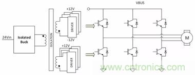 圖13. 使用隔離式降壓轉(zhuǎn)換器、具有隔離式IGBT柵極驅(qū)動偏置的3相逆變器