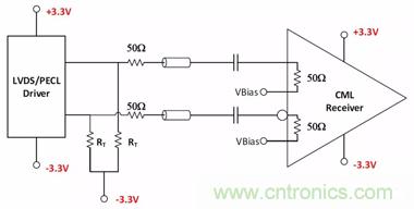 圖14顯示了LVDS/PECL驅(qū)動器至CML接收器接口的框圖。