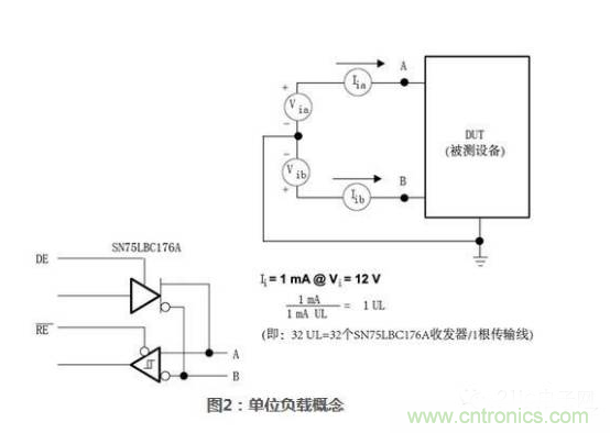 圖2給出了SN75LBC176A收發器單位負載計算的例子。因為這款設備將驅動器和接收器集成到一起構成了收發器(即驅動器輸出和接收器輸入連接到了同一根總線上),因此很難分別獲取驅動器泄漏電流和接收器輸入電流。為了便于計算,將接收器輸入阻抗看作12 k?并給收發器1mA電流。這可以代表一個單位負載,一跟傳輸總線上允許32個這樣的負載。