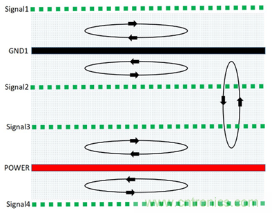 (1)由于信號(hào)層與回流參考平面相鄰,S1、S2、S3相鄰地平面,有最佳的磁通抵消效果,優(yōu)選布線層S2,其次S3、S1。