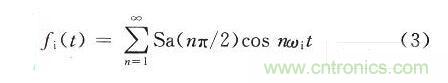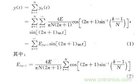 首先對量化過程進(jìn)行分析,現(xiàn)假設(shè)基帶輸入信號為一個正弦信號gi(t)=Esinωit,量化位數(shù)為N,經(jīng)過量化后的信號可用階梯波y(t)表示,y(t)可以被認(rèn)為是N對矩形波的疊加。如果A/D變換的量化位數(shù)為m,那么正或負(fù)半周的量化臺階數(shù)為N=2m-1。階梯波的表達(dá)式為: