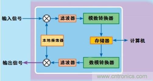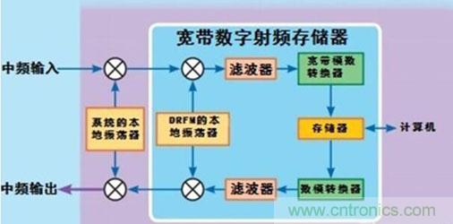 如下圖所示,數(shù)字射頻存儲器可以將接收信號轉(zhuǎn)換為中頻(IF)信號。然后將中頻信號的帶寬數(shù)字化。數(shù)字化信號被存儲在存儲器中傳輸?shù)接嬎銠C(jī)。計算機(jī)對信號進(jìn)行必要的分析和修正,使其滿足干擾技術(shù)需求。