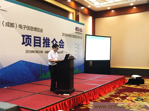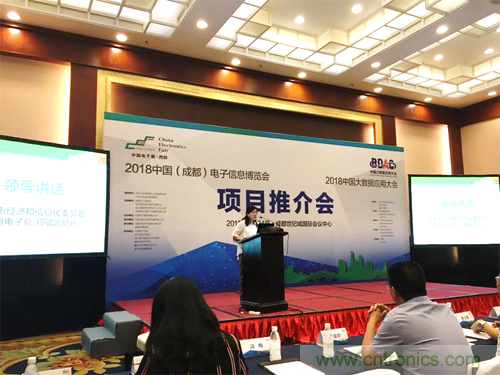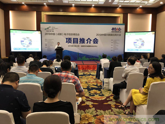 2018年5月24日下午, 2018中國(成都)電子信息博覽會暨2018中國大數據應用大會在成都世紀城國際會議中心召開項目推介會。活動由中電會展與信息傳播有限公司總經理宋偉主持,四川省經濟和信息化委員會電子處蘇平處長,成都市經濟和信息化委員會通用電子處副處長鄧敏出席推介會并致辭,中國電子器材總公司總經理陳雯海向來賓介紹了2018中國(成都)電子信息博會項目整體情況和2018中國大數據應用大會項目的相關進展情況,四川省大數據產業聯合會常務副秘書長朱小軍,代表合作伙伴在推介會上進行了發言,四川省其他30家相關學協會等也參加了本次活動。另外,現場還有超過50家媒體及100家成都及四川地區電子信息產業相關企業及組織出席項目推介會。
