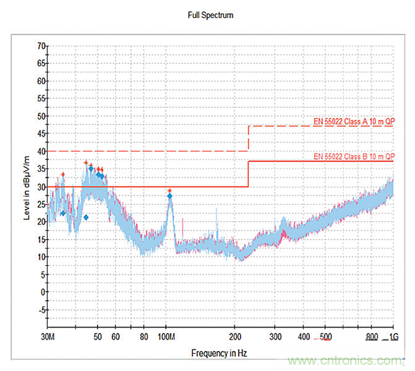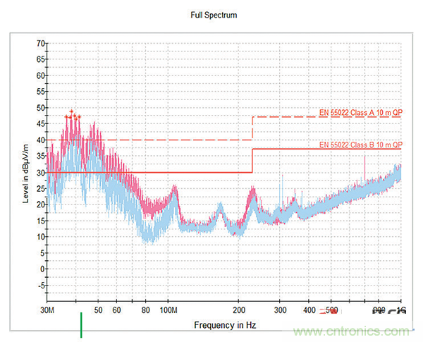 這種濾波器插入設計提供了最大的屏蔽效能,并使等效串聯電感最小化,為芯片電容器提供可用的最佳性能,同時還利用了系統中已存在的屏蔽。結合專用的22000pF濾波器,濾波器插入實現了圖10所示的結果,從而以具有成本效益的長期解決方案來滿足EMC法規。