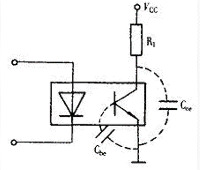 由于光耦自身存在的分布電容,對傳輸速度造成影響,光敏三極管內(nèi)部存在著分布電容Cbe和Cce,如圖4所示。由于光耦的電流傳輸比較低,其集電極負(fù)載電阻不能太小,否則輸出電壓的擺幅就受到了限制。但是,負(fù)載電阻又不宜過大,負(fù)載電阻RL越大,由于分布電容的存在,光電耦合器的頻率特性就越差,傳輸延時也越長。