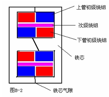 最后說一說繞組線圈的結構,因為膽機的后級都是用對管組成推挽電路的,為了防止由于兩管負載不平衡所引鐵芯起直流磁化,上下管的負載繞組不僅要做到電感一致,并且直流電阻也要一致,另外為了較少線間分布電容,在繞法上采取分層分邊的繞法,如圖B-2是音頻輸出變壓器繞組的結構剖面圖。這種繞組結構可使上下輸出管的總電抗保持一致,從減少線間的分布電容的角度來看,層分得越多越細越好,從而使輸出信號的頻響特性得到較好的改善。