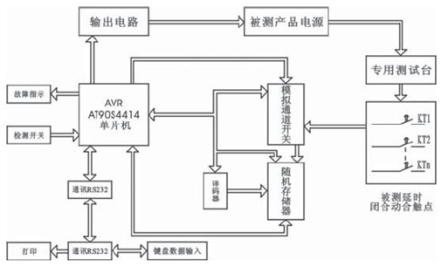 在測試過程中,被測產品的延時數據的檢測是通過對檢測信號(用被測產品的延時閉合的動合觸點)來進行監測,而被檢測產品的工作電源又為工作變壓器初級線圈(一般都為批次檢測)屬電感性負載。由于對被檢測的產品的時間延時參數是與產品工作電源的加入同步進行,待被檢測的產品并對其延時參數數據進行存儲都完成后,而相應的執行程序對其被檢測產品進行逐一檢測確定后,將被檢測產品工作電源關斷且延長一定時間后,然后再進行下一次延時檢測(工作電源重新加入循環進行)到所需檢測的次數完成后,對所存儲的數據進行處理(將每只產品延時數據進行從大到小排列,選出N次數據量中的最大值tmax,以及最小值tmin。對其數據進行算術平均值處理 。