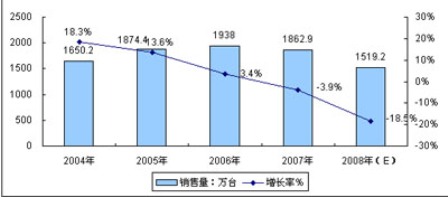 圖1 2003-2008(E)年中國(guó)DVD播放機(jī)銷售量規(guī)模與增長(zhǎng)