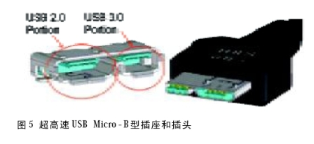解決方案:在現有插頭和插座的插入面新增5 條導線。這樣就提供了與USB 2.0相同的機械接口,提供了完整的后向兼容性(見圖3~圖5)。現有的Micro-B 型插座(見圖5)無法提供空間用于新增5條導線,因此需要進行較大的更改,用同時提供2.0和3.0接口的方案。這種連接器應該只用于小型的便攜式設備。為了避免不正確的插入,超高速USB Micro-A和AB型連接器與Micro-B 型連接器在咬合栓和輪廓方面是不同的,但在其他方面則完全相同。與機械后向兼容性一樣,這樣做的目的是保留大量的設備驅動基礎設施。相同的數據傳輸類型、中斷、塊狀和等時存儲設備都保留了下來。最后,這個標準保留了現有USB的易用性。