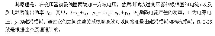 因此,(2-81)、(2-82)、(2-83)、(2-84)式最好只用于對正激式輸出的單激式開關(guān)電源變壓器進(jìn)行磁滯損耗和渦流損耗功率測試,因?yàn)槠涑跫壘€圈的電感相對比較大,勵磁電流比較小;如果需要對反激式輸出的單激式開關(guān)電源變壓器進(jìn)行測試,最好只用于對小功率開關(guān)電源進(jìn)行對比測試。