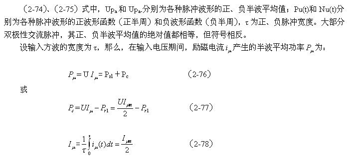 順便指出:(2-84)式的結(jié)果,是認(rèn)為渦流損耗在t1-t2期間(圖2-26-b)完全等于0而求得的,但實(shí)際上,在t1-t2期間變壓器初級線圈產(chǎn)生的反電動勢同樣也會在變壓器鐵芯中感應(yīng)產(chǎn)生渦流損耗電流,即當(dāng)輸入電壓為0時(shí)刻,在變壓器鐵芯中還存在很短暫時(shí)間的渦流損耗;由于這種渦流損耗是由反電動勢提供能量來維持的,它將隨著反電動勢能量的衰減很快就衰減到0。