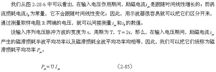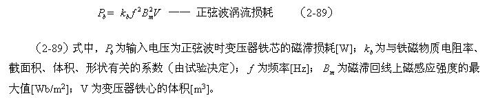這里順便指出,利用(2-88)和(2-89)式來分別測(cè)試變壓器鐵心的磁滯損耗和渦流損耗是非常困難的;一個(gè)是它們的系數(shù)很難決定,另一個(gè)是兩者很難分別進(jìn)行測(cè)量,或從測(cè)量結(jié)果中進(jìn)行分離。對(duì)比兩式的參數(shù)就可以知道,它們之間最大的區(qū)別是頻率對(duì)損耗的影響程度;一個(gè)是與頻率成正比,另一個(gè)是與頻率的平方成正比。