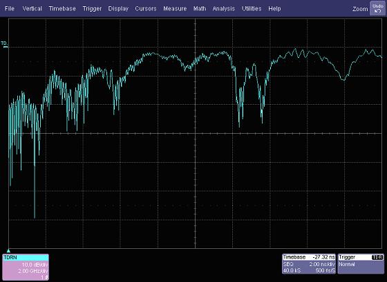 回波損耗或S11 是頻域的測量和反射系數有關。歸一化(通過反射平面校準 基線校正)反射系數的傅里葉變換給出了回波損耗是頻率的函數。圖2給出了USB 3.0線纜和連接器測量的結果。圖中的橫軸表示2GHz/div,范圍是0~20GHz,縱軸表示10dB/div?;夭〒p耗在2GHz大約是15dB,但隨著頻率的增加開始變得越來越小。精細的空值間隔是由線纜末端的連接器引起的,較大的空值間隔是由于連接器內部的阻抗結構決定的。