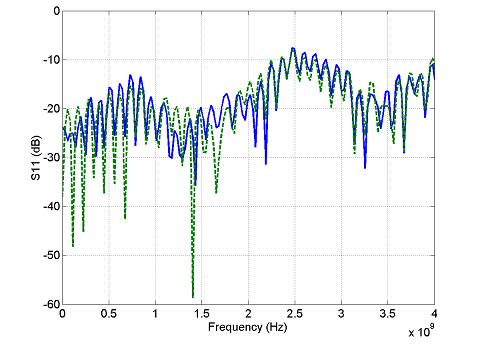 Figure 3: Return loss measured with 100 ohm reference (dotted line) and 90 ohm (solid line) reference