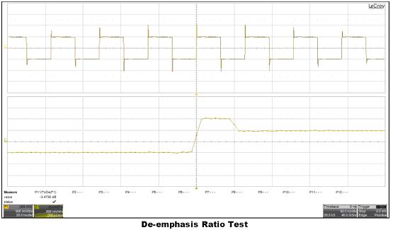 為了把5Gbps速率的數(shù)據(jù)傳送較遠的距離,USB3.0的發(fā)送端使用了去加重技術(shù),這項測試可以測量DUT的去加重程度是否滿足規(guī)范要求(要求在-3dB到-4dB之間)。測試時DUT發(fā)送出CP7碼流,CP7碼型由50-250個連續(xù)的1和50-250個連續(xù)的0重復交替組成,而且是添加了去加重的信號波形。圖3為某USB3.0芯片的去加重測量結(jié)果,該芯片采用了-3.47dB的去加重。