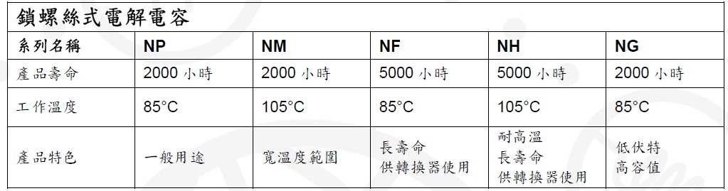 全新推出的工業級超長效鎖螺絲式電解電容系列包括NP、NM、NF、NH、NG 等五個系列,分別鎖定一般用途、寬溫度范圍、長效轉換器、高溫環境轉換器以及低電壓大容值等應用。工作溫度范圍涵蓋85°C 至105°C;使用壽命時效,則一舉提升至2000 到5000 小時。與其他同類型產品相比,具備難以匹敵的寬溫度范圍及長時效特性。