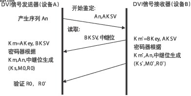 HDCP具體工作過程:首先由主機發(fā)送密鑰選擇導引序列(AKSV)和64bit偽隨機序列(An)到接收方,接收方回傳密鑰選擇導引序列(BKSV)和轉(zhuǎn)發(fā)器位(REPEAT-bit)(如是轉(zhuǎn)發(fā)器用以表示身份),發(fā)送方確認BKSV是否已被廢除和是否包含20個1和20個0;如果雙方的設(shè)備密鑰和KSV有效,則計算產(chǎn)生一個56bit的公共密鑰Km和Km`,然后可產(chǎn)生KS、KS`(傳輸密鑰)、M0、MO`(64bit后續(xù)驗證用追加初始序列)、RO、R0`(16bit指示驗證成功,它必須在AKSV發(fā)送后100ms內(nèi)傳回發(fā)送方;驗證成功后R01和R0相等;每128幀修正一次,每2s回傳一次)。因此當DVI接口中斷傳輸2s以上,或是非授權(quán)設(shè)備接收時,主機將停止傳輸內(nèi)容,以達到保護傳輸內(nèi)容的目的。HDCP鑒定處理過程如圖6所示。