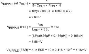 選擇輸出電容的關鍵參數是實際電容值、ESR、ESL和額定電壓。這些參數會影響系統的整體穩(wěn)定性、輸出電壓紋波以及瞬態(tài)響應,輸出紋波電壓包含三部分,即輸出電容儲存電荷的變化,電流流入、流出電容時在ESR和ESL上產生的壓降。下面給出了選擇電容使用的公式。