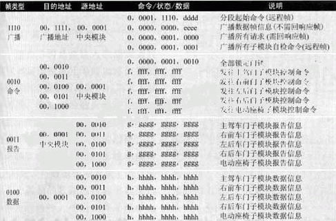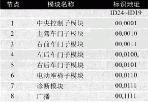本協議遵循CAN2.0B規范,根據車身控制模塊的特點,采用源→目的方法,每個節點都有自己固定的標識地址,且節點數小于64,設計時可將中央控制模塊設為主節點,而將車門、電動座椅子模塊及自檢子模塊設置為從節點。本協議可完成以下功能: