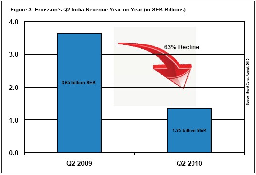 今年7月,諾基亞西門子通信和愛立信報告稱,其第二季度營業(yè)收入因印度的審查延誤而大幅減少。諾基亞西門子通信稱減少2.57億美元。愛立信沒有給出具體的損失數字,但該公司在印度的營業(yè)收入同比下降63%,相當于總計損失了3.12億美元,如圖3所示。
