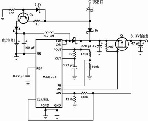 不少便攜式USB設備脫離主機后改由內部電池組通過直流變換器繼續供電,故而需要配備一個小型UPS電源,圖3便是一種由單片開關電源MAX1703構成的實用電路。該集成器件采用同步整流PWM升壓型電路結構;可以單節鎳鎘/鎳氫電池供電,最低輸入電壓0.7V,輸出電壓可調范圍為2.5~5.5V,最大輸出電流1.5A,電源變換效率可達95%。圖3中,MAX1703開關電源“POUT”端的輸出電壓設定為3.4V,而由P溝道場效應管Q1與片內備用放大器構成的線性穩壓器輸出電壓為3.3V,故而USB外設由電池組供電時Q1的功率損耗幾乎可以忽略。外部設備與USB口接通時,二極管D1為正向偏置而使開關電源處于“空閑”狀態;也就是只要Q1的源極電壓高于3.4V,外部設備便始終由USB口供電。與此同時,USB口還通過PNP晶體管Q2等組成的恒流源向電池組充電,調整電阻R1的阻值可以設定充電電流,使之符合十小時充電制的要求。一旦外部設備脫離USB口,開關電源便會立即退出“空閑”狀態而由內部電池組繼續供電。