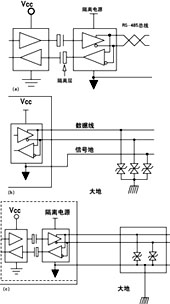 3. 采用隔離接口。有些情況下,出于安全或其他方面的考慮,電路地必須與機殼或大地相連,不能懸浮,這時可以采用隔離接口來隔斷接地回路,但是仍然應該有一條地線將隔離側的公共端與其它接口的工作地相連(圖4d)。