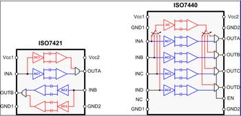 四通道隔離器用于隔離包括數據和控制線路的接口(例如:SPI),其數據速率一般可達20到80Mbps。電感和電容隔離器之間的電流消耗在30Mbps下時已經有10mA以上的差別,在如100Mbps等更高數據速率下時這一差別可高達40mA。