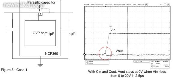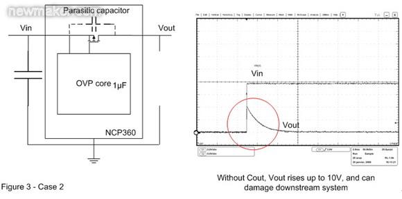 在圖3的案例2中,輸出電容已被移除。這樣,當(dāng)OVP器件輸入端出現(xiàn)快速輸入瞬態(tài)現(xiàn)象時(shí),旁路元件將保持開路。這時(shí)可以在輸出端觀察到過沖,這個(gè)過沖可能會(huì)損壞連接至OVP輸出端的電子元器件。為了解決這個(gè)問題,必須在輸出引腳上連接一個(gè)輸出電容,并盡量靠近OVP 器件擺放。